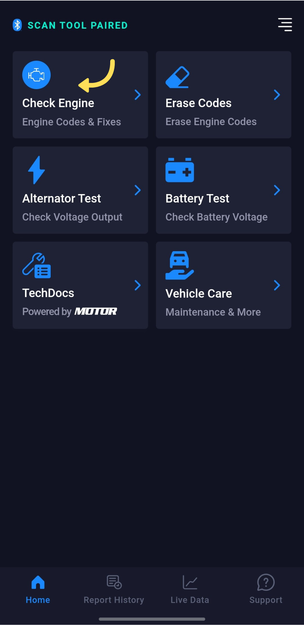 After pairing with the RS2 app, select the Scan Engine. The scan engine runs a monitor test for the check engine light and creates a report detailing your engine's specific problems.